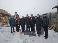 В рамках марафона социальной помощи «Zабота» 20 ноября 2025 года специалист отдела по работе с участниками специальной военной операции и членами их семей ОГБУ «Управление социальной защиты и социального обслуживания населения по Ольхонскому району» совместно с руководителем «Движение первых», социальным педагогом и волонтерами МБОУ «Еланцынской средней школы» посетили родителей участника специальной военной операции, состоящих на социальном обслуживании на дому, для оказания помощи в виде уборки снега во дворе и расколки дров.